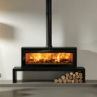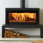 |   click the images to enlarge  | The largest in Stovax’s Studio range is the striking Studio 3 Freestanding wood burning stove. This highly efficient and visually impressive wood burning stove has the same 11kW of heat output and stunning widescreen views of the flames as its inset fire equivalent but offers a very different look. Designed to be sited on to the optional 180 Bench, or hearth mounted to achieve the distinctive stove look, the Studio 3 Freestanding will create maximum visual impact in rooms of larger proportions. It also has the ability to be fitted with an optional rear heat shield to reduce the distance to combustible materials behind the appliance and extend the styling possibilities further still.