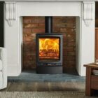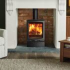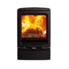 | click the images to enlarge | Featuring a large window that provides an uninterrupted view of the impressive flame picture, the Vogue Midi is one of the latest contemporary wood burning stoves to join the Stovax range. The stove’s advanced Cleanburn triple air injection system ensures that the flames fill the firebox whilst keeping the viewing glass clear to enjoy a fuller flame picture. In addition, the highly efficient combustion process produces a nominal 5kW heat output – providing ample warmth whilst realising the fuel’s full potential. The Vogue Midi’s customisable design presents a variety of installation options. Homeowners can opt for either hearth mounted, plinth or Midline installations in order to create the desired look. Both the plinth and Midline log store bases are styled with matching subtle curves that perfectly complement the cast iron door and integral top plate.