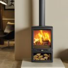 | click the images to enlarge | The Stovax Vogue Medium wood burning stove provides an impressive 7kW of heat, making it a great choice for larger living spaces. With an expansive stove window that features self-cleaning Airwash technology, the Medium’s superb flame visuals provide a captivating focal point on a cold winter’s eve. Featuring the very latest combustion technology, this eco-friendly, wood burning stove burns so cleanly it is compliant with future Ecodesign emission.