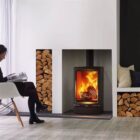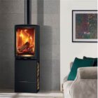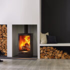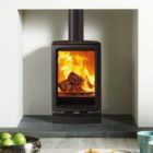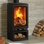 | click the images to enlarge | The Stovax Vogue Midi T is a taller version of the Vogue Midi wood burning stove, offering the same ultra cleanburn capability of the Midi, but featuring a more portrait firebox. Displaying superb visuals through the large stove window, the powerful Airwash system ensures the flames can always be appreciated. The Midi T can be installed with the Midline log store base for convenient fuel storage and increased height.